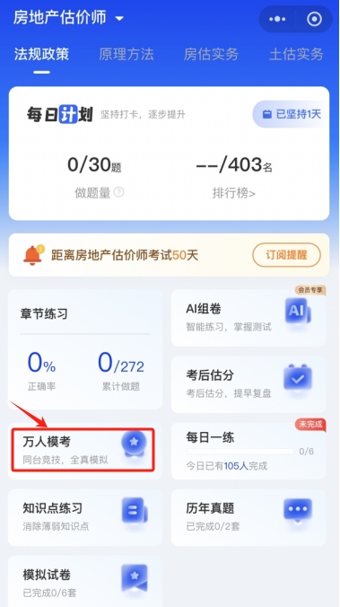 方法1:微信搜索“正保刷題寶”小程序并進(jìn)入,選擇好輔導(dǎo)”房地產(chǎn)估價(jià)師“點(diǎn)擊進(jìn)入,即可看到”萬(wàn)人??肌鞍粹o,點(diǎn)擊進(jìn)入即可免費(fèi)做題測(cè)驗(yàn)成績(jī)。