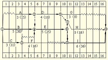 某工程項(xiàng)目業(yè)主通過工程量清單招標(biāo)確定某承包商為該項(xiàng)目中標(biāo)人,并簽訂了工程合同,工期為16天。該承包商編制的初始網(wǎng)絡(luò)進(jìn)度計(jì)劃(每天按一個(gè)工作班安排作業(yè))如圖6-1所示,圖中箭線上方字母為工作名稱,箭線下方括號外數(shù)字為持續(xù)時(shí)間,括號內(nèi)數(shù)字為總用工日數(shù)(人工工資標(biāo)準(zhǔn)均為45.00元/工日,窩工補(bǔ)償標(biāo)準(zhǔn)均為30.00元/工日)。由于施工工藝和組織的要求,工作A、D、H需使用同一臺施工機(jī)械(該種施工機(jī)械運(yùn)轉(zhuǎn)臺班費(fèi)800元/臺班,閑置臺班費(fèi)550元/臺班),工作B、E、I需使用同一臺施工機(jī)械(該種施工機(jī)械運(yùn)轉(zhuǎn)臺班費(fèi)600元/臺班,閑置臺班費(fèi)400元/臺班),工作C、E需由同一班組工人完成作業(yè),為此,該計(jì)劃需做出相應(yīng)的調(diào)整。