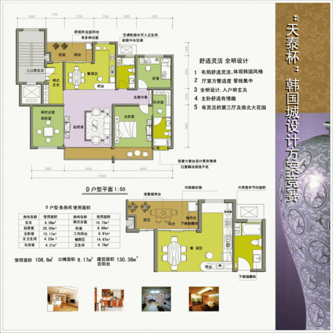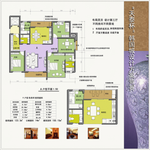 天泰韓國(guó)城·漢城區(qū)地處李滄區(qū)308國(guó)與富昌路交界處,位于天泰·奧園巴塞羅那區(qū)西南側(cè),南臨小區(qū)規(guī)劃人工湖,依湖而建,環(huán)境優(yōu)美,地處小區(qū)景觀中心區(qū),由4個(gè)小高層和3個(gè)高層組成。總占地面積為三萬(wàn)多平米,建筑面積四萬(wàn)五千平米,車庫(kù)面積也接近二萬(wàn)平米,綠化率達(dá)到45%,規(guī)劃車庫(kù)包括地上地下兩種類型,配置比例為1:1.小區(qū)共有300余戶,主要戶型有二室二廳一衛(wèi)、三室二廳二衛(wèi)、四室二廳二衛(wèi)和躍層,面積從100平方米到220平方米不等。主要戶型有二室二廳一衛(wèi)、三室二廳二衛(wèi)、四室二廳二衛(wèi)和躍層,面積從100平方米到220平方米不等,小區(qū)為全裝修,在風(fēng)格上定位為韓式,樓間景觀獨(dú)特多樣,融合了韓式風(fēng)情與本土特色,是島城為數(shù)不多的以韓式風(fēng)格為主的健康運(yùn)動(dòng)小區(qū)。
