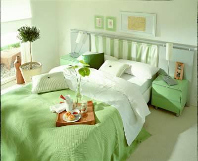淡淡的果綠色會給房間帶來清新甜美氛圍。果綠色的床品,一對綠、白色的靠墊和小型花插讓自然氣息更加質(zhì)樸濃郁。