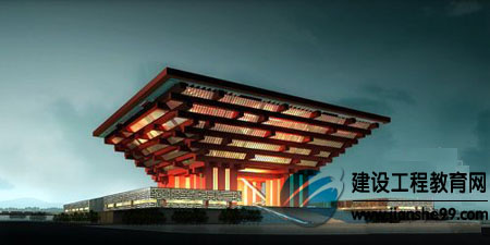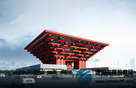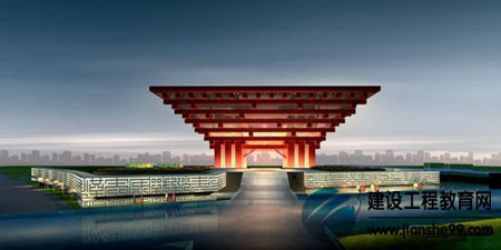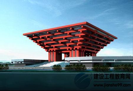 從開工當(dāng)日公布的效果圖來看,取名“東方之冠”的中國館雖然全部由巨型鋼構(gòu)架構(gòu)成,但斗拱形頂部連同4 根混凝土柱子,又酷似一只巨大的四腳鼎,大面積的紅更凸顯了中國特色。