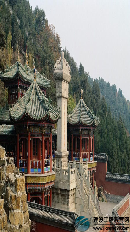 我國古建筑的外部造型,也盡量表現(xiàn)出與自然協(xié)調(diào)的意念。他不象西方建筑那樣是實體一塊的龐然大物,而是有虛有實,輪廓柔和,曲線豐富,在穩(wěn)重中呈現(xiàn)出一定的變化。臺基除了對木結構的防水,防腐功能之外,可以增加古建筑的穩(wěn)定感。柱梁斗拱等組成的木構架,輕盈同透,給人以靈動的觀感。碩大的屋頂鋪以漂亮的反曲線和輕巧多姿的翼角,給予建筑一種柔性的適應感,使之與山水林木等自然環(huán)境取得了相當?shù)暮椭C。