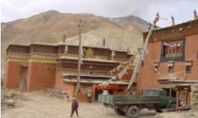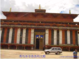 收分墻體和柱網(wǎng)結(jié)構(gòu)是構(gòu)成藏式傳統(tǒng)建筑在視覺和構(gòu)造上堅固穩(wěn)定的基本因素。由于自然和歷史等條件限制,藏式傳統(tǒng)建筑使用的木梁較短,在兩個木梁接口下面用一個斗拱,再用柱子支起斗拱,連續(xù)使用幾個柱拱梁構(gòu)架,形成了柱網(wǎng)結(jié)構(gòu)。藏式傳統(tǒng)建筑使用柱網(wǎng)結(jié)構(gòu)擴大了建筑空間,增強了建筑物的穩(wěn)定性。墻體的砌筑采用了三種方法,有效地提高了建筑的穩(wěn)定性。一是收分墻體。墻體下面寬、上面窄,墻體收分角度一般在5度左右,建筑物重心下移,保證了建筑物的穩(wěn)定性。二是加厚墻體。由于歷史上砌筑材料主要以生土和毛石為主,為增加建筑高度,采用了加厚墻體的作法,如楚布寺主殿的墻厚有3米,桑耶寺烏孜大殿的墻厚有4米,使得建筑物十分堅固。三是做邊瑪墻。即在墻的上部用一種當?shù)厣L的邊瑪草做一段墻,既減輕了墻體荷截,又有很好的裝飾效果。這些都對藏式傳統(tǒng)建筑起到了很好的堅固和穩(wěn)定的作用,提高了建筑物的安全性和抵御自然災害的能力。