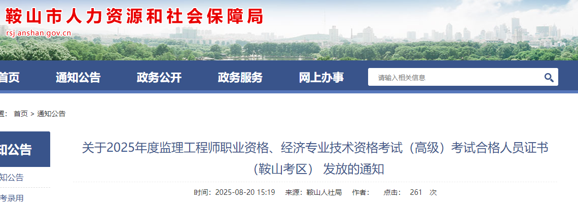 關于2025年度監(jiān)理工程師職業(yè)資格、經(jīng)濟專業(yè)技術資格考試(高級)考試合格人員證書(鞍山考區(qū))發(fā)放的通知