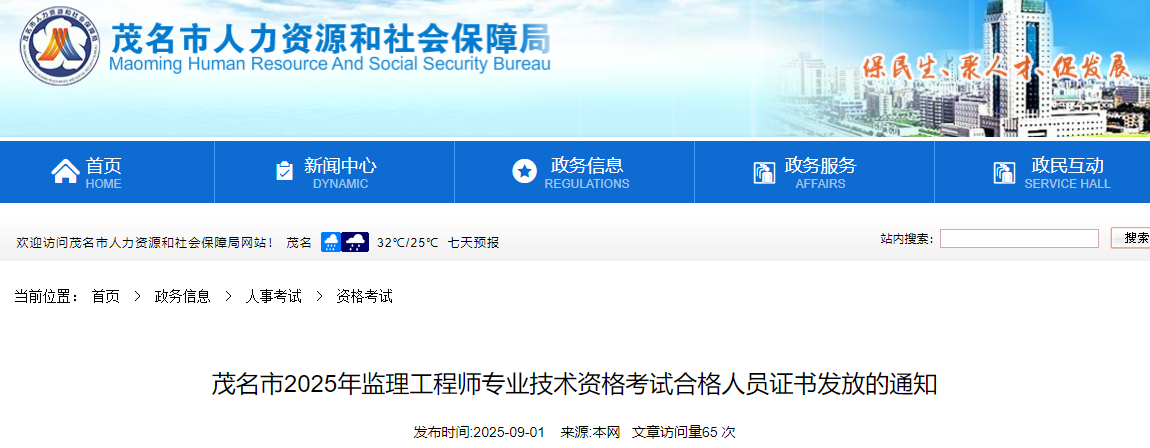 廣東茂名市2025年監(jiān)理工程師專業(yè)技術(shù)資格考試合格人員證書發(fā)放的通知