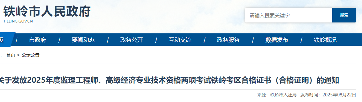 關(guān)于發(fā)放2025年度監(jiān)理工程師、高級經(jīng)濟專業(yè)技術(shù)資格兩項考試鐵嶺考區(qū)合格證書(合格證明)的通知