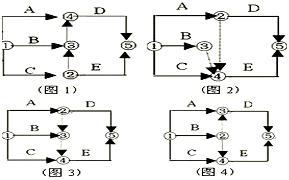 某雙代號(hào)網(wǎng)絡(luò)圖有A、B、C、D、E五項(xiàng)工作,其中A、B完成后D開始,B、C完成后E開始,能夠正確表達(dá)上述邏輯關(guān)系的圖形是(?。?。