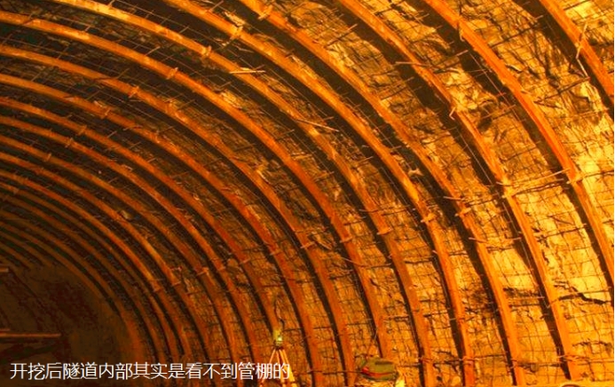 管棚是在施工隧道工程中,向前開挖之前就先圍著開挖輪廓線的外側向開挖前方以一個非常小的外插角(近乎平行于隧道)插入到土體的。
