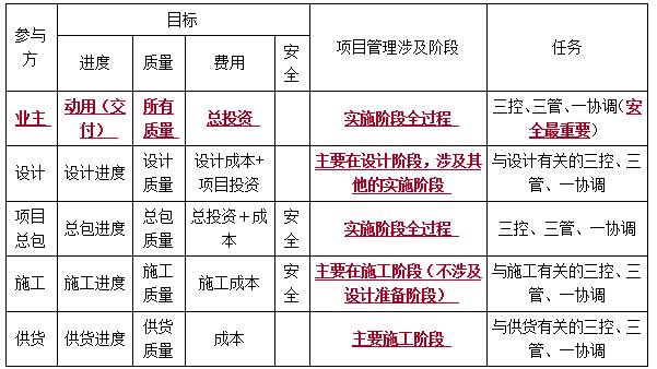 各方項目管理的目標(biāo)和任務(wù)(業(yè)主)-一級建造師管理考點