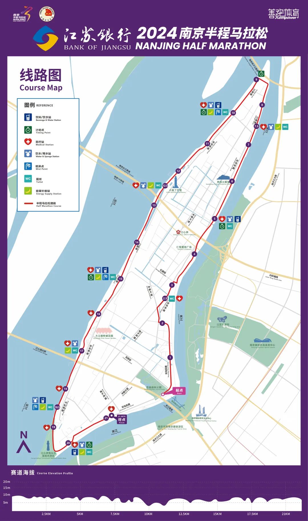 賽道串聯(lián)南京眼步行橋、長江江豚科教中心、小墾丁燈塔、大江側(cè)粉黛花海等眾多網(wǎng)紅打卡點(diǎn)。前國際奧委會主席羅格曾贊譽(yù)環(huán)島江堤為“全世界最美馬拉松賽道”,2019年該賽道被評為“江蘇省最美跑步線路”。
