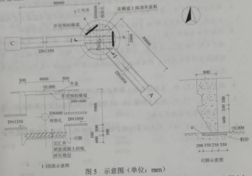 某項(xiàng)目部承接一項(xiàng)頂管工程,其中DN1350mm管道為東西走向,長度90m;DN1050mm管道為偏東南方向走向,長度80m。設(shè)計要求始發(fā)工作井y采用沉井法施工。接收井A,C為其他標(biāo)段施工(如圖5示)。項(xiàng)目部按程序和要求完成了各項(xiàng)準(zhǔn)備工作。