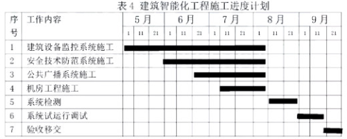 安裝公司項(xiàng)目部進(jìn)場(chǎng)后,了解商業(yè)中心建筑的基本情況,建筑設(shè)備安裝位置、控制方式和技術(shù)要求等。依據(jù)監(jiān)控產(chǎn)品進(jìn)行深化設(shè)計(jì),再依據(jù)商業(yè)中心工程的施工總進(jìn)度計(jì)劃,編制了建筑智能化工程施工進(jìn)度計(jì)劃(見(jiàn)表4),該進(jìn)度計(jì)劃在被安裝公司審批時(shí)被否定,要求重新編制。