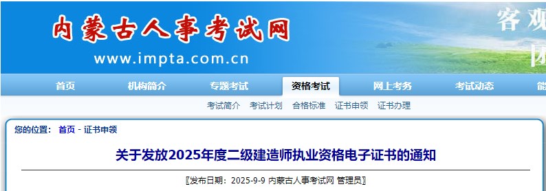 內蒙古發(fā)布關于2025年度二級建造師執(zhí)業(yè)資格電子證書的通知