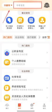 1.打開皖事通APP并登錄,定位到“六安市”,點(diǎn)擊首頁“搜索框”。
