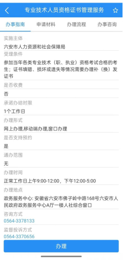 2.輸入“專業(yè)技術(shù)人員資格證書管理服務(wù)”,選擇“辦事”模塊,點(diǎn)擊下方“專業(yè)技術(shù)人員資格證書管理服務(wù)”,選擇辦事地區(qū)“六安市”,點(diǎn)擊“去辦理”。