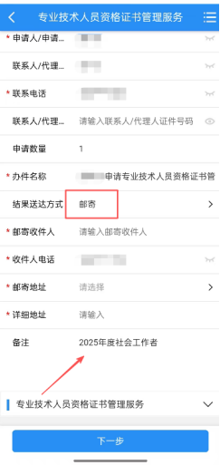 3.“結(jié)果送達(dá)方式”選擇“郵寄”,完善郵寄收件人姓名、電話、地址等信息,在“備注”欄填寫擬申領(lǐng)證書的考試年度和名稱,如“2025年度社會(huì)工作者”,點(diǎn)擊“下一步”,最后在跳轉(zhuǎn)的頁面中點(diǎn)擊“提交申請(qǐng)”即可完成。