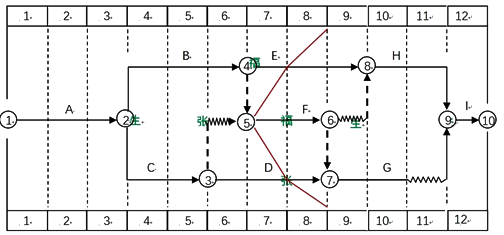 在第8個(gè)月末,施工單位對(duì)現(xiàn)場(chǎng)實(shí)際進(jìn)度進(jìn)行檢查,并在時(shí)標(biāo)網(wǎng)絡(luò)圖中繪制了實(shí)際進(jìn)度前鋒線,如圖所示: