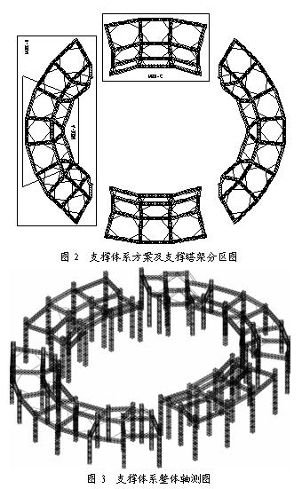 答:國家體育場(鳥巢)屋蓋鋼結(jié)構(gòu)支撐塔架的柱身選用3×3m格構(gòu)柱,為提高支撐塔架的整體剛度和穩(wěn)定性,在支撐塔架的頂部設(shè)置水平支撐體系,支撐體系仍采用格構(gòu)式桁架結(jié)構(gòu)。為提高水平支撐體系的抗扭剛度,在其角部區(qū)域設(shè)置隅撐,支撐塔架的柱腳與基礎(chǔ)采用剛接。根據(jù)主結(jié)構(gòu)的安裝方案,將整體支撐塔架分成四大塊,長短軸各兩個區(qū)塊,并將這四區(qū)塊所有支撐塔架連成整體。這個方案符合主桁架安裝、形成自受力體系的過程,方案如下圖所示: