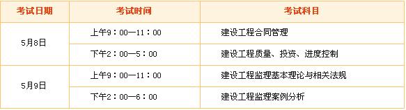 考試分4個(gè)半天進(jìn)行,《建設(shè)工程合同管理》、《建設(shè)工程監(jiān)理基本理論與相關(guān)法規(guī)》的考試時(shí)間為2個(gè)小時(shí);《建設(shè)工程質(zhì)量、投資、進(jìn)度控制》的考試時(shí)間為3個(gè)小時(shí);《建設(shè)工程監(jiān)理案例分析》的考試時(shí)間為4個(gè)小時(shí)。