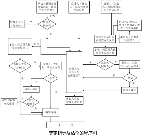 3、承包人認(rèn)為可能要發(fā)生變更的情形承包人收到監(jiān)理人按合同約定發(fā)出的圖紙和文件,經(jīng)檢查認(rèn)為其中存在變更情形的,可向監(jiān)理人提出書面變更建議。 監(jiān)理人收到承包人書面建議后,應(yīng)與發(fā)包人共同研究,確認(rèn)存在變更的,應(yīng)在收到承包人書面建議后的14天內(nèi)作出變更指示。經(jīng)研究后不同意作為變更的,應(yīng)由監(jiān)理人書面答復(fù)承包人。