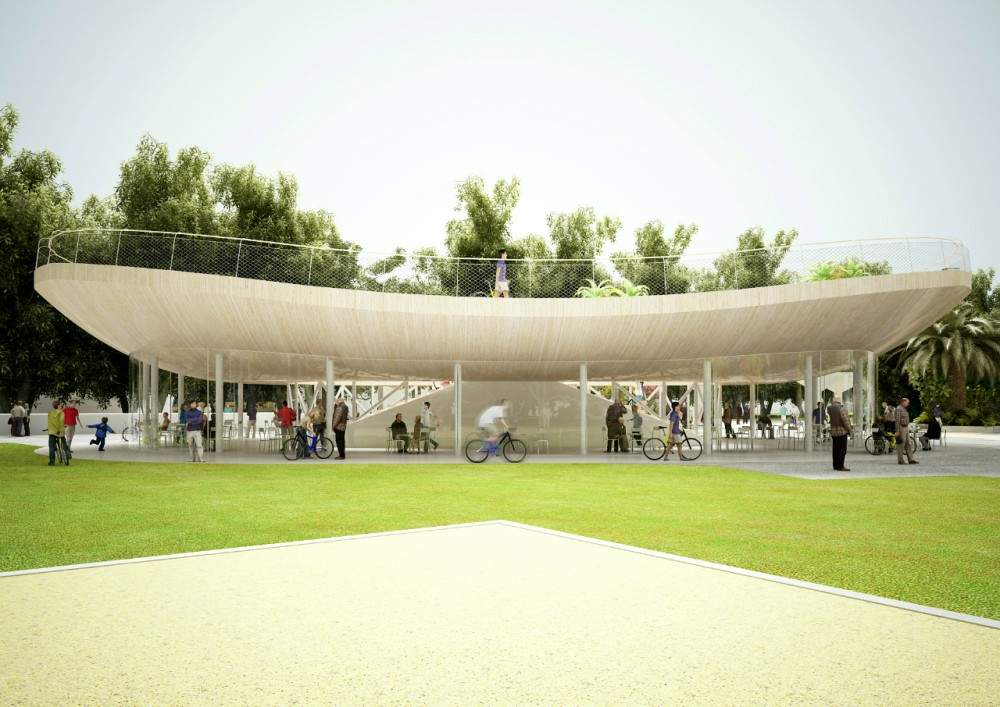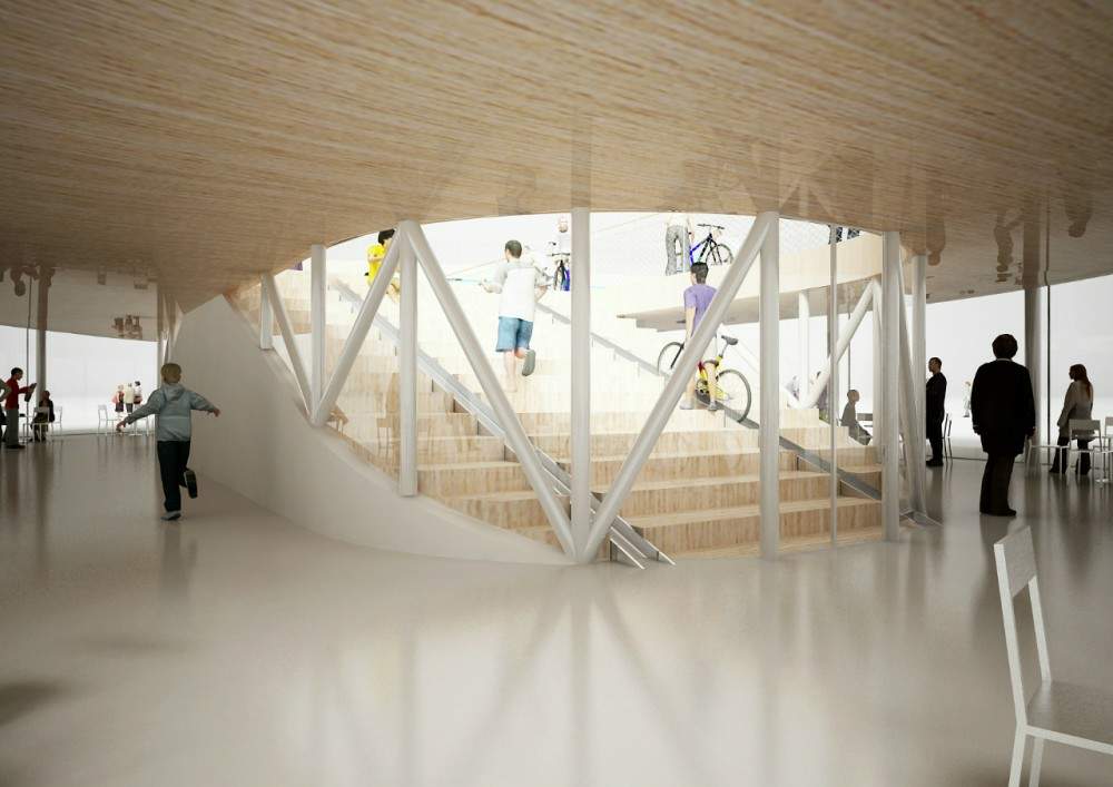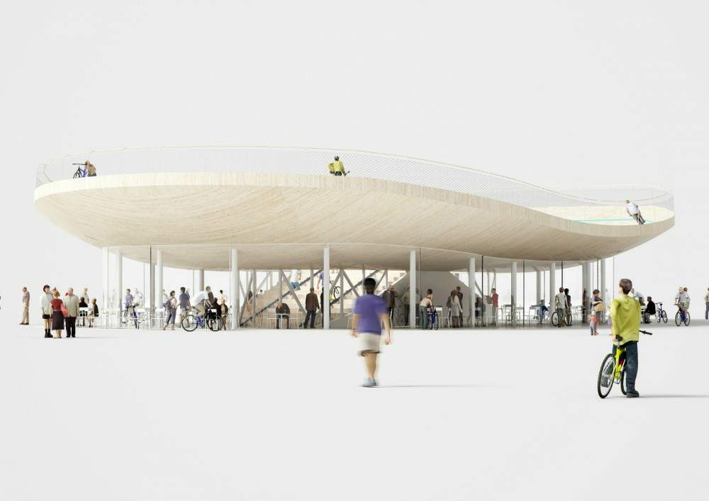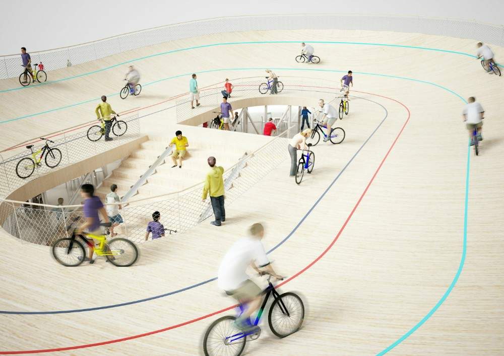 該項(xiàng)目是由阿姆斯特丹建筑事務(wù)所NL architects設(shè)計(jì)的“自行車俱樂部”,位于中國海南。一個(gè)屋頂自行車跑道由底層的玻璃幕墻咖啡館支撐。建筑師根據(jù)當(dāng)?shù)氐臒釒夂,在橢圓形的建筑物上設(shè)計(jì)了一個(gè)突出的大屋頂,為周邊的看臺(tái)座位遮陰避雨。優(yōu)雅上揚(yáng)的曲線屋頂讓人聯(lián)想到傳統(tǒng)且具有功能性的東方寺院寶塔。參觀者可以通過一個(gè)凹槽,步行去到兩個(gè)樓梯,將自行車移動(dòng)到露天單車賽道上。隱藏在樓梯下方的區(qū)域包含了公共休息室等空間。