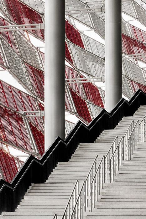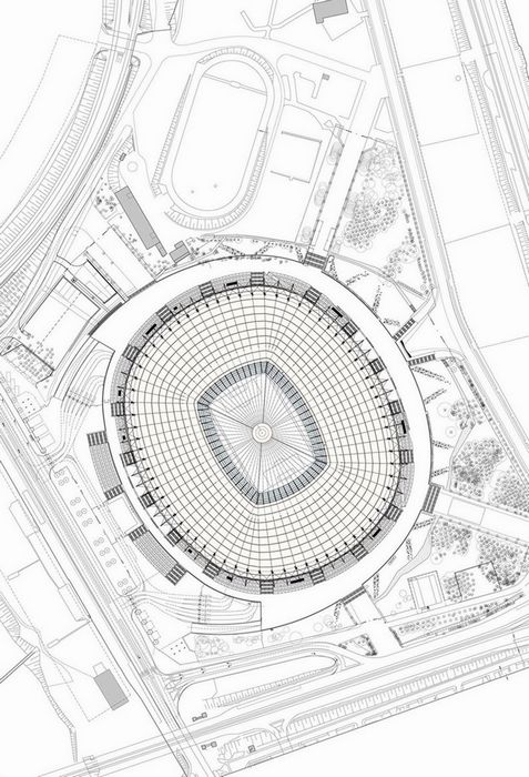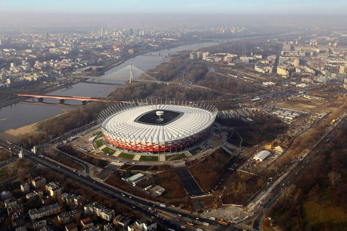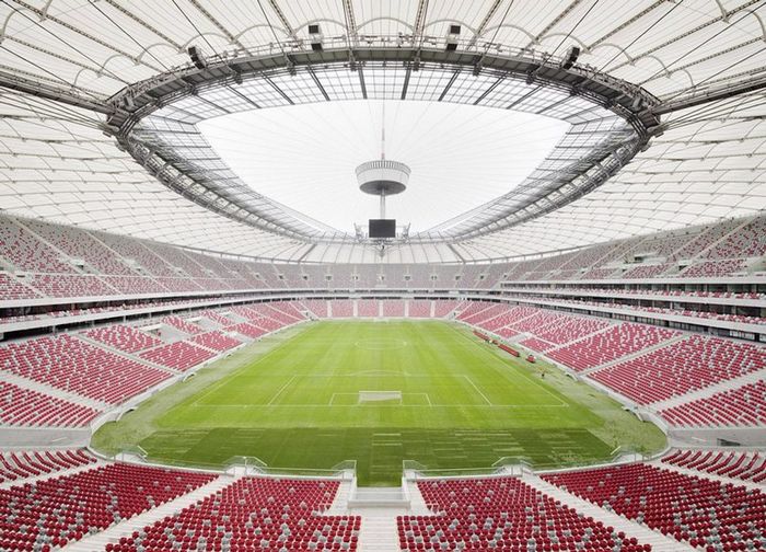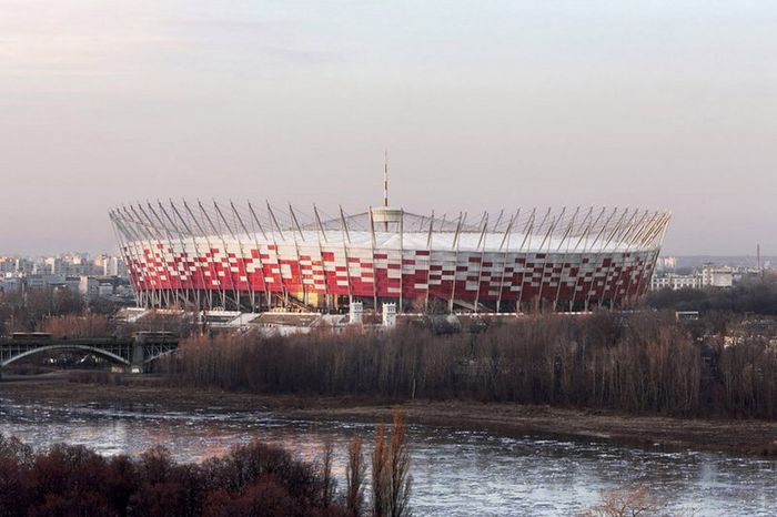 波蘭的國家體育館是基源于Dziesie Ciolecia體育場的基礎(chǔ)上進(jìn)行改建的,其地理位置位于華沙城市中心區(qū)域的東部,比鄰維斯瓦河河畔城市體育區(qū)的核心位置。這個體育館被等分為對稱的兩個區(qū)域,由預(yù)制混凝土構(gòu)成的建筑主體看臺部分,以及構(gòu)建在斜拉桿獨立式鋼鐵支架上的帶有紡織層面的鋼絲網(wǎng)屋頂部分組成。內(nèi)部的屋頂是由折疊在一起的移動膜組成的。體育館擁有一個立方體四屏幕顯示屏,可以為坐在任何一個角度的觀眾提供最佳的視線。 另外,人們可以通過體育館四周的12個拱形的單行梯階達(dá)到建筑主體的頂部夾層。建筑外立面使用的金屬材料可以提供一個保暖而透明的外殼。場館的主體顏色選用為紅白色主調(diào)以表現(xiàn)其國家的地標(biāo)性。
