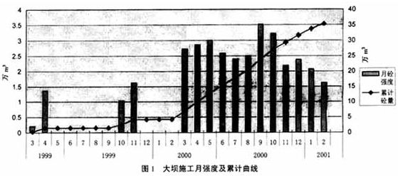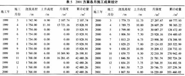 方案2001:2000年3月復(fù)工,冬、夏季均不停工,按擬定澆筑參數(shù)預(yù)測大壩后續(xù)工期。
