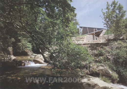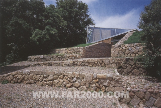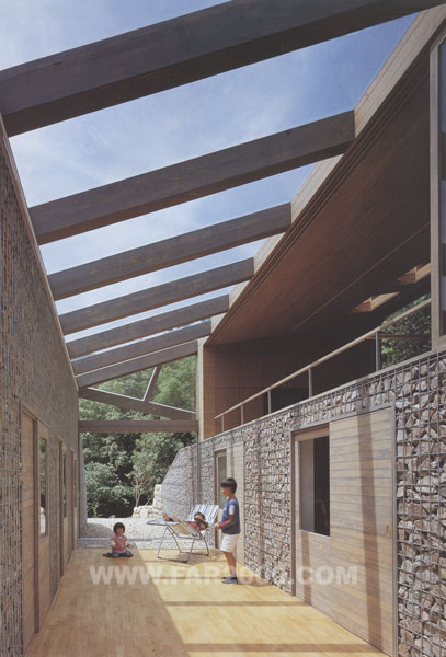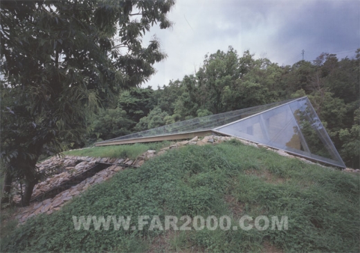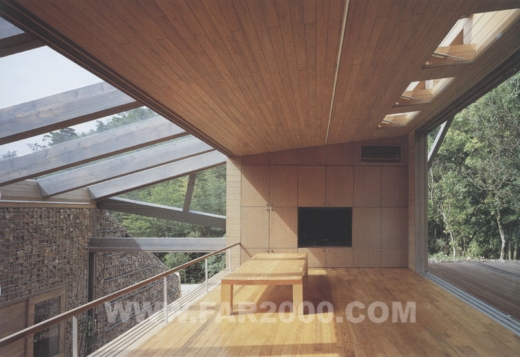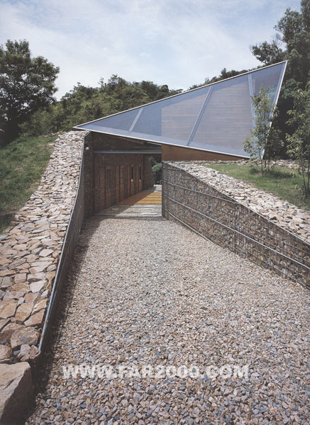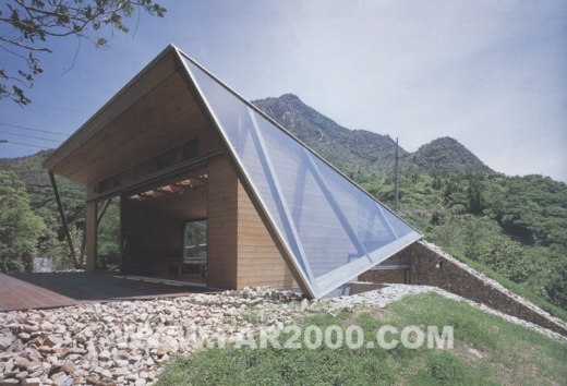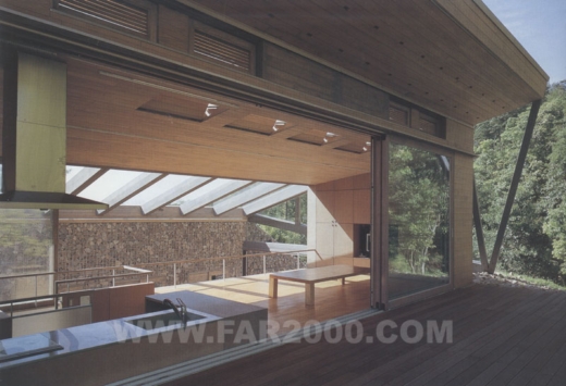 該建筑位于瀨戶內(nèi)海周邊平原與山地交界處的山谷之中,包括防護(hù)林在內(nèi)的地皮面積超過了12000平方米,可謂廣袤無邊。設(shè)計(jì)師因地制宜,考慮了風(fēng)向、日照等因素受到地形的影響,作了一次創(chuàng)造性的嘗試。山谷的形狀從西北向東南延伸,所以陽光照射面清晨為西、傍晚為東。照射面與非照射面之間產(chǎn)生溫差,空氣流動方向隨之變化,導(dǎo)致了山谷風(fēng)的形成。由此,獨(dú)特的室外風(fēng)道穿插于住宅中,其方向與山谷一致,仿佛是山谷的縮景。兩側(cè)住宅面向風(fēng)道而開門,外周環(huán)繞著保熱性能良好的土墻。風(fēng)、光從風(fēng)道一側(cè)進(jìn)入室內(nèi),營造了一個冬暖夏涼、夜暖晝涼的宜人環(huán)境。風(fēng)道上方裝有木框玻璃桁架。玻璃和天花板之間的集熱層可收集太陽能,保持室內(nèi)溫度。打開各房間的門窗隔扇,風(fēng)道便會與地下室連通,在豎直方向?qū)⑸焦蕊L(fēng)導(dǎo)入作為動力源。關(guān)上門窗隔扇時室內(nèi)能量得以密閉儲存,維持冬季供暖。大玻璃窗使主人在房間內(nèi)能夠欣賞窗外的自然風(fēng)景,感受四季的變幻。自然的恩惠必然會賜予人們舒適與安寧的生活,這正是設(shè)計(jì)師想要達(dá)到的。