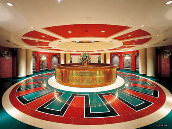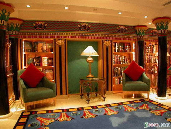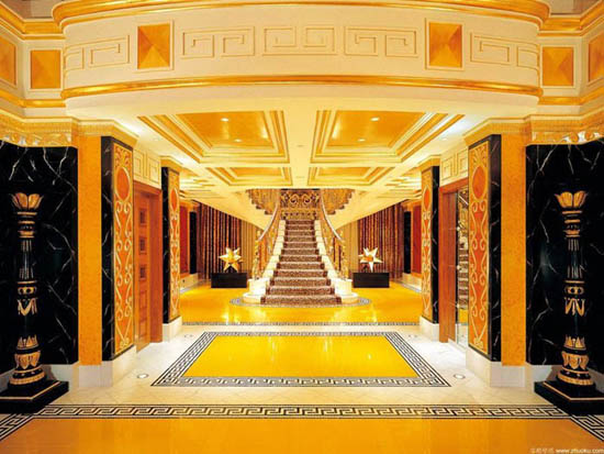 這座看起來(lái)好像是正在行進(jìn)中的帆船形象的酒店建在海濱的一個(gè)人工島上,是一個(gè)帆船形的塔狀建筑,一共有56層,321米高,由著名的英國(guó)設(shè)計(jì)師W.S. Atkins設(shè)計(jì)。酒店采用雙層膜結(jié)構(gòu)建筑形式,造型輕盈、飄逸,具有很強(qiáng)的膜結(jié)構(gòu)特點(diǎn)及現(xiàn)代風(fēng)格。它擁有202套復(fù)式客房、200米高的可以俯瞰迪拜全城的餐廳。到過(guò)阿拉伯塔酒店之后,你才能體會(huì)到真正意義的“金碧輝煌”。它的中庭是金燦燦的,它的最豪華的780平方米的總統(tǒng)套房更是華麗非凡,在第25層,家具是鍍金的,設(shè)有一個(gè)電影院、兩間臥室、兩間起居室、一個(gè)餐廳,出入有專用電梯?头棵娣e從170平方米到780平方米不等。七星級(jí)酒店房?jī)r(jià)肯定不菲,最低也要900美元,總統(tǒng)套房則要1.8萬(wàn)美元。這家酒店擁有八輛寶馬和兩輛勞斯萊斯,專供住店旅客直接往返機(jī)場(chǎng),也可從旅館28層專設(shè)的機(jī)場(chǎng)坐直升機(jī),花15分鐘空中俯瞰迪拜美景?腿巳绻朐诤ur餐廳中就餐的話,他們將被潛水艇送到餐廳,這樣他們就餐前可以欣賞到海底奇觀。