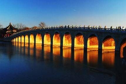 它是仿盧溝橋而建,之所以為十七孔,據(jù)說是因?yàn)榛始乙?ldquo;九”為尊,天為陽,地為陰,在數(shù)字里,奇數(shù)為陽,九是至陽之?dāng)?shù),代表了天,也就代表了皇權(quán)。而十七孔橋不論從哪邊數(shù)都是第九個(gè)孔在中間。