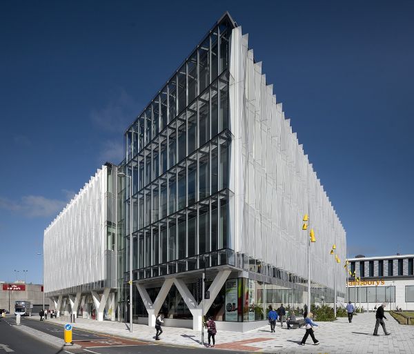 塔樓、防洪提、游樂場等大體量結(jié)構(gòu)在布萊克浦市有一定的歷史和傳統(tǒng)。這些標(biāo)志性結(jié)構(gòu)已經(jīng)成為布萊克浦的一部分,一提到這座城市,人們就會想到這些建筑。本案建筑的主立面——北側(cè)和西側(cè)的一層室外設(shè)置了多個Y形的支柱,這些支柱將兩個入口連接起來,并凸顯了沿著通往市中心的公共交通路線分布的商業(yè)零售空間的門臉。