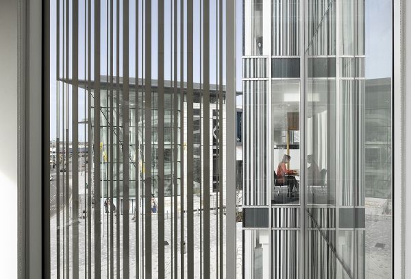 落有致的燒結(jié)垂直玻璃板為大面積的玻璃立面增添了一絲趣味,還能夠阻擋部分陽光,避免室內(nèi)出現(xiàn)過熱現(xiàn)象。