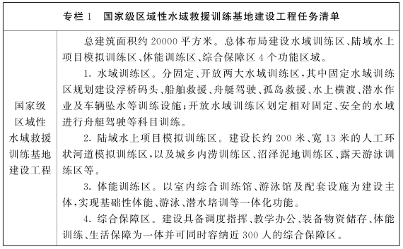(一)國(guó)家級(jí)區(qū)域性水域救援訓(xùn)練基地建設(shè)工程。作為國(guó)家布局建設(shè)的6個(gè)區(qū)域性水域救援訓(xùn)練基地之一,立足江西洪澇災(zāi)情、輻射長(zhǎng)江流域,采取部省共建方式,依托我省九江廬山西海省級(jí)水域救援訓(xùn)練基地建設(shè)“貼近實(shí)戰(zhàn)、設(shè)施完備、功能齊全、師資雄厚、運(yùn)行高效”的國(guó)家級(jí)訓(xùn)練基地,2023年建成,打造全國(guó)水域救援訓(xùn)練基地建設(shè)“江西樣板”,為消防救援隊(duì)伍培養(yǎng)優(yōu)秀水域救援專業(yè)人才。