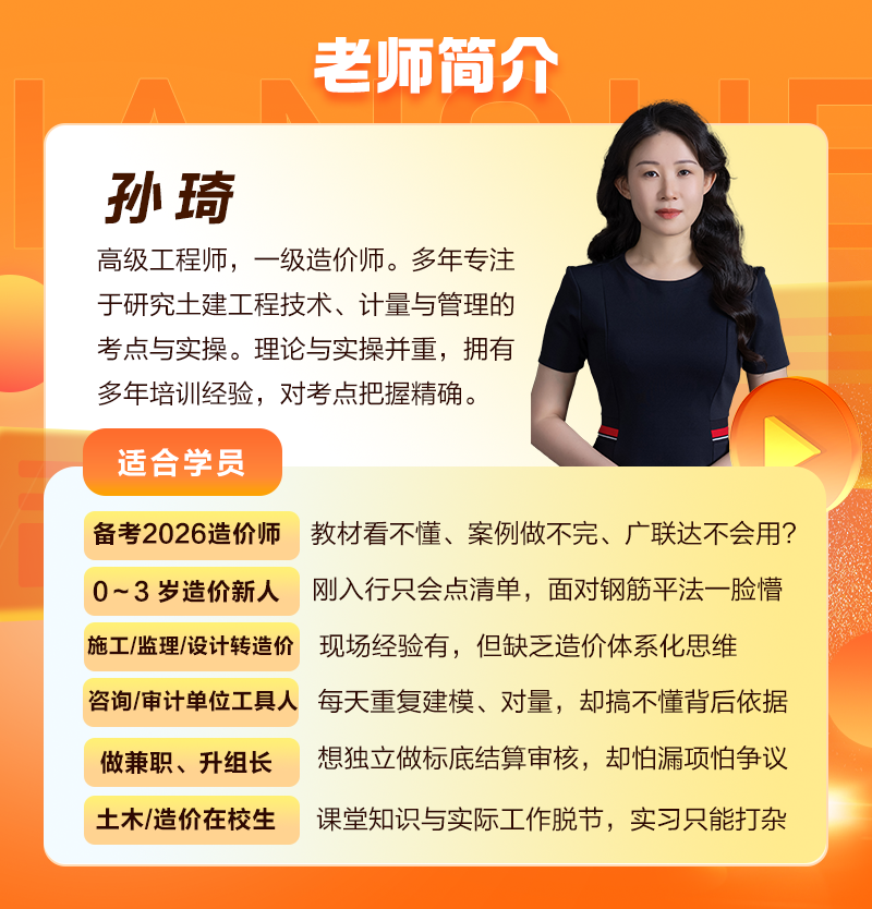 孫琦老師:高級工程師,一級造價(jià)師。多年專注于研究土建工程技術(shù)、計(jì)量與管理的考點(diǎn)與實(shí)操。理論與實(shí)操并重,擁有多年培訓(xùn)經(jīng)驗(yàn),對考點(diǎn)把握精確。講課細(xì)致耐心,直達(dá)核心找準(zhǔn)問題,理論與實(shí)操并重,原理背景信手拈來。授課該繁則繁,該簡則簡,用“大白話”講透復(fù)雜算法,被學(xué)員親切稱為“孫媽”。