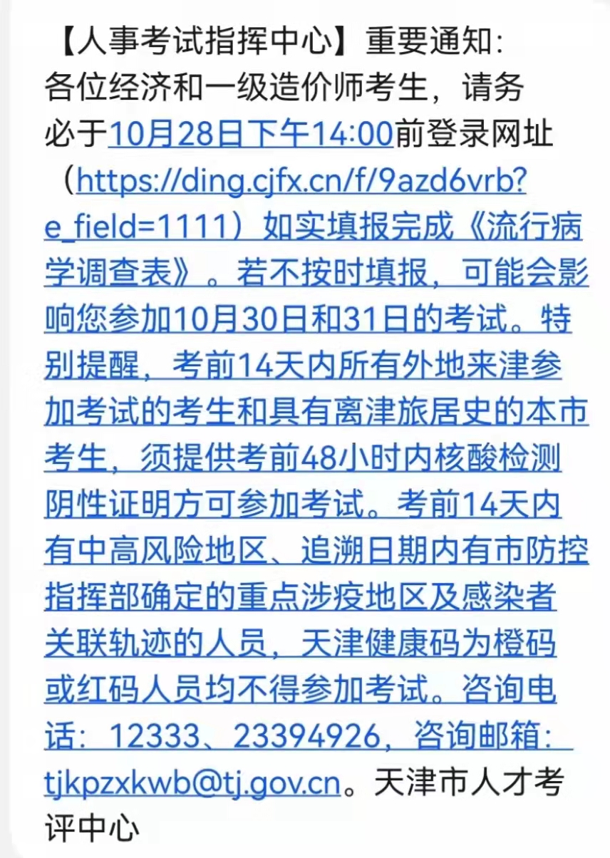 各位一級(jí)造價(jià)師考生,請(qǐng)務(wù)必于10月28日下午14:00前登錄網(wǎng)址(如實(shí)填報(bào)完成《流行病學(xué)調(diào)查表》。若不按時(shí)填報(bào),可能會(huì)影響您參加10月30日和31日的考試。特別提醒,考前14天內(nèi)所有外地來(lái)津參加考試的考生和具有離津旅居史的本市考生,須提供考前48小時(shí)內(nèi)核酸檢測(cè)陰性證明方可參加考試??记?4天內(nèi)有中高風(fēng)險(xiǎn)地區(qū)、追溯日期內(nèi)有市防控指揮部確定的重點(diǎn)涉疫地區(qū)及感染者關(guān)聯(lián)軌跡的人員,天津健康碼為橙碼或紅碼人員均不得參加考試。咨詢電話:12333、23394926,咨詢郵箱:。