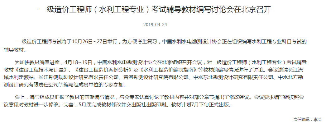 中國水利水電勘測設計協會:一級造價師教材計劃7月下旬正式出版