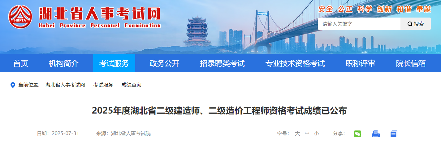 2025年度湖北省二級(jí)造價(jià)工程師資格考試成績于2025年7月31日公布,請(qǐng)考生到湖北人事考試網(wǎng)“成績查詢”欄目進(jìn)行查詢。官方通知如下: