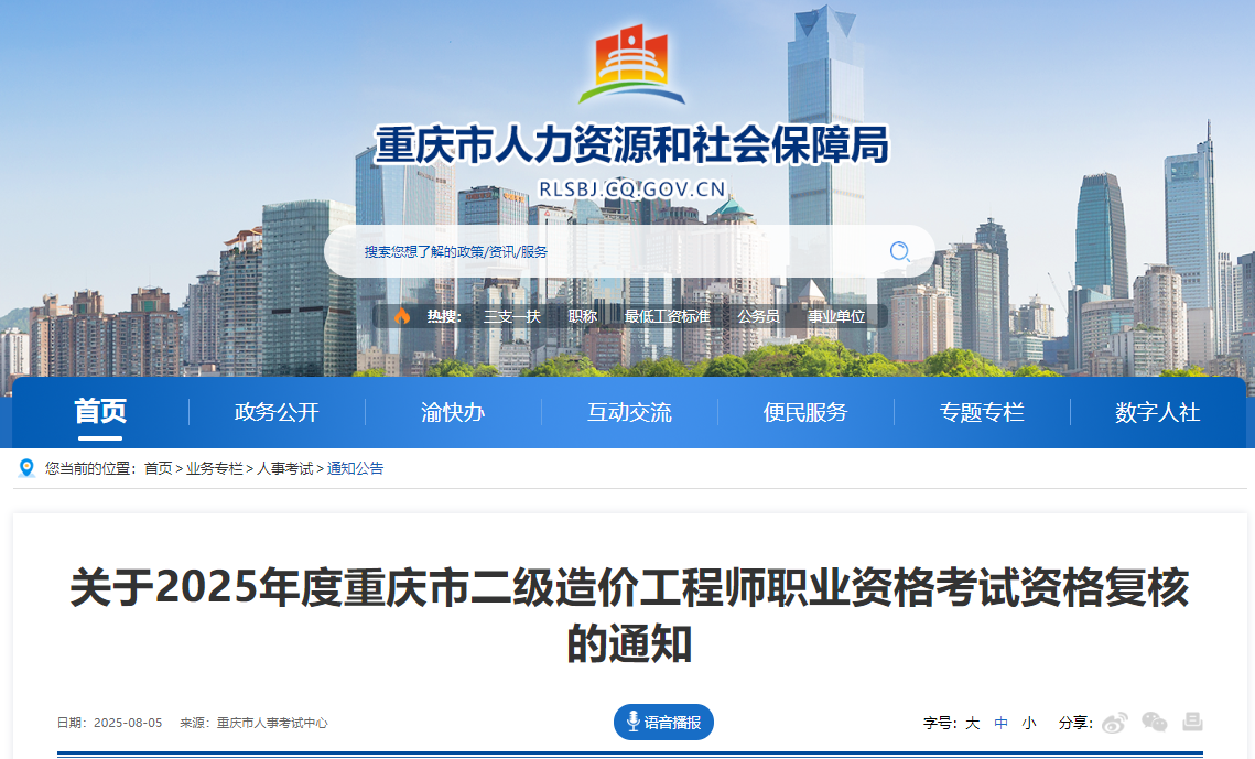 重慶市2025年度二級(jí)造價(jià)工程師職業(yè)資格考試資格復(fù)核通知已發(fā)布,網(wǎng)上復(fù)核受理時(shí)間為:2025年8月6日9:00—8月12日10:00。官方通知如下: