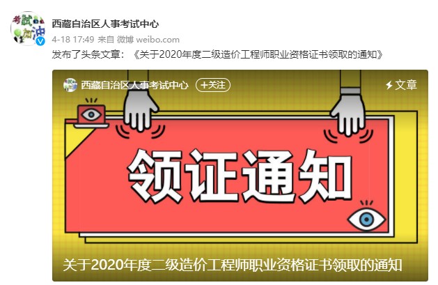 西藏關(guān)于2020年度二級(jí)造價(jià)工程師職業(yè)資格證書領(lǐng)取的通知