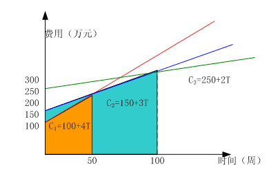 您看C1和C2的位置圖,當(dāng)T小于50周的時候,C2的線在C1上面,說明,C2的費(fèi)用在此前比C1高,此時選用費(fèi)用較低的C1方案合適;(也就是圖中紅色區(qū)域的位置)但是超過兩者的交點(diǎn)50之后,C1就比C2高了,此時選用費(fèi)用較低的C2方案就合適了。